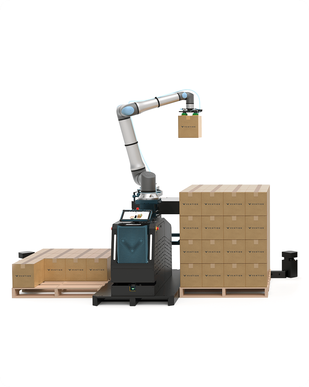Kombinieren Sie industrielle Stärke und Geschwindigkeit mit der Einfachheit der Cobot-Palettierer-Bedienung.