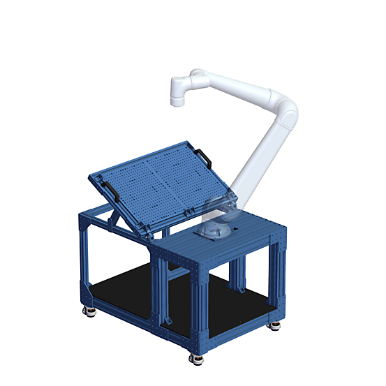 Part presenter with large adjustable angled surface, with evenly spaced M8-threaded holes, for a robot machine tending cell. Mounting plates available for Universal Robots UR10e and UR16e, Fanuc CRX-10iA, Doosan M-Series, and other medium-sized cobots. Add options for grippers (Schunk), calibration (Flexxbotics) or Robot-to-CNC communication (Versabuilt).
