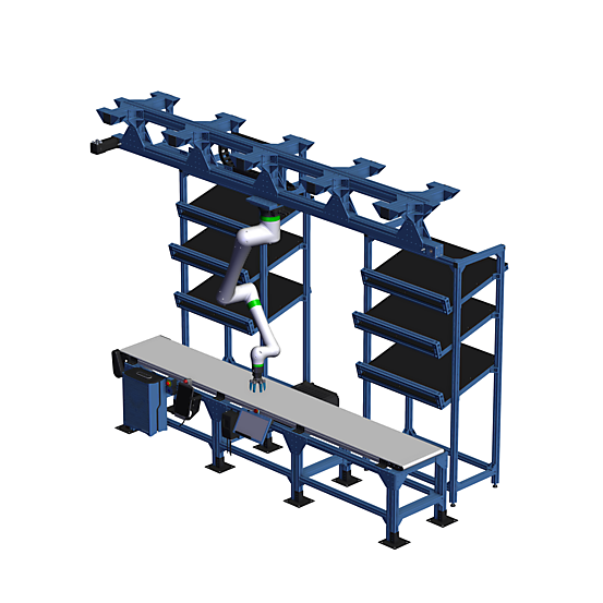 Pick and place robot cell designed for FANUC CRX robots. The ceiling-mounted range extender has a range of 3.1 meters. A very robust and compact Heavy-Duty Enclosed Timing Belt actuator is used for the range extender. A floor-mounted belt conveyor is included to handle products, and two (2) shelving units are used to store products. All parts shown are included. ALL EQUIPMENT MUST BE ANCHORED. PLEASE REVIEW BEFORE PURCHASING (support@vention.io).
