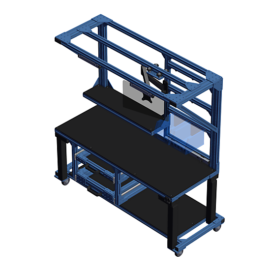 A Vention workstation featuring ergonomic features and versatile storage options. This mobile workstation has a heavy-duty electric lift assembly included to adjust the workstation at different height. The tabletop is made of a custom cut plastic panel. Accessories such as LED lights, powerbar, din rail, tool hangers and screen mounting arm are all included.