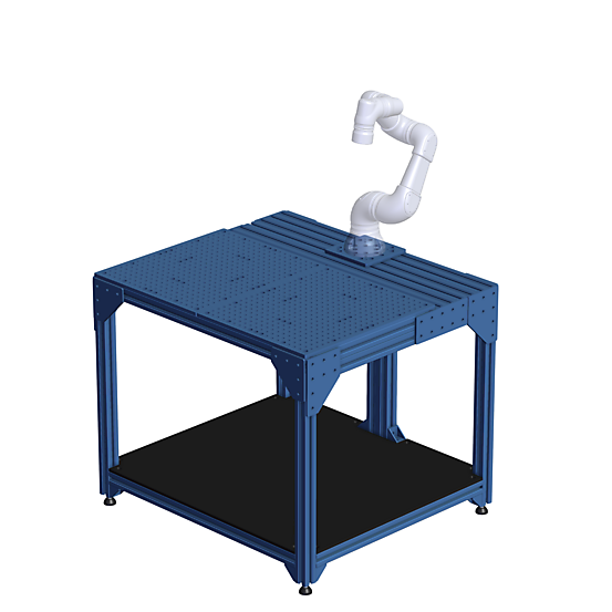 Vention robot cell compatible with Universal Robots, Fanuc and more! Designed with t-slot aluminum extrusions, tooling plates and complete access to the robot which can be placed anywhere along the extrusion tabletop. A dedicated area is available under the table top to install the robot controller. Robot is not included.