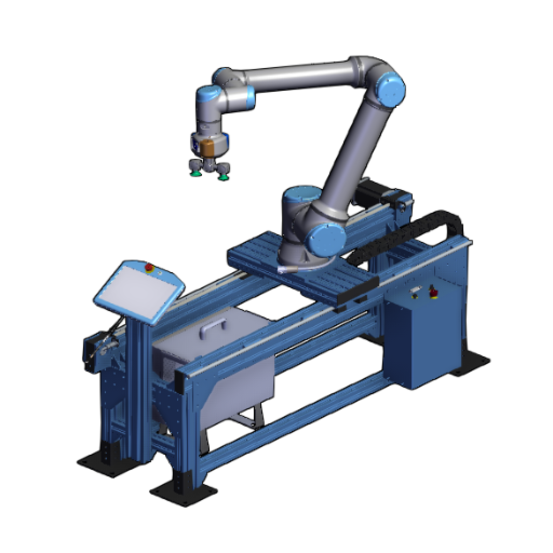 Range extender for Universal Robots UR10e. The 7th axis displacement is 1300mm. Comes with MachineMotion controller, and UR Caps to integrate seamlessly with Universal Robots. A Schamlz vacuum gripper is used as an end-of-arm-tool.