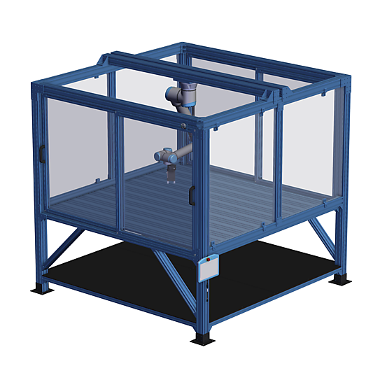This enclosed robot workstation is designed for an overhead installation of collaborative robots. Sliding doors with polycarbonate panels are available on each side of the station, with interlocking systems to safely secure the work area. A dedicated area is available under the table top to install the robot controller and other components.