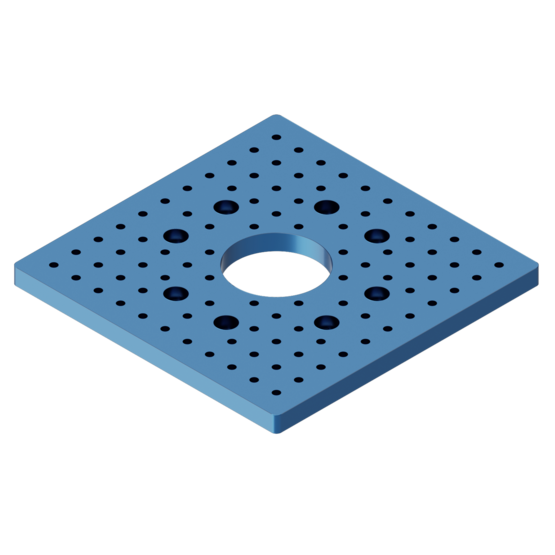 This Robot Adaptor Plate can be mounted anywhere on the 5/8'' Welding Table Top. It is compatible with Vention’s Multi-Robot Mounting Plates and features threaded M8 mounting holes on a 22.5x22.5mm grid pattern.