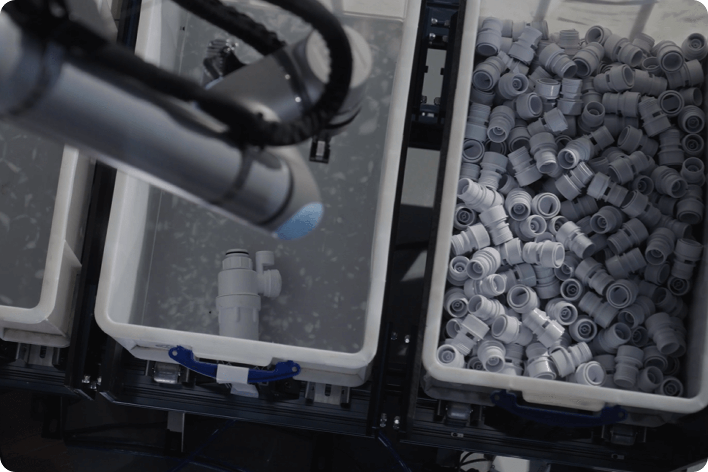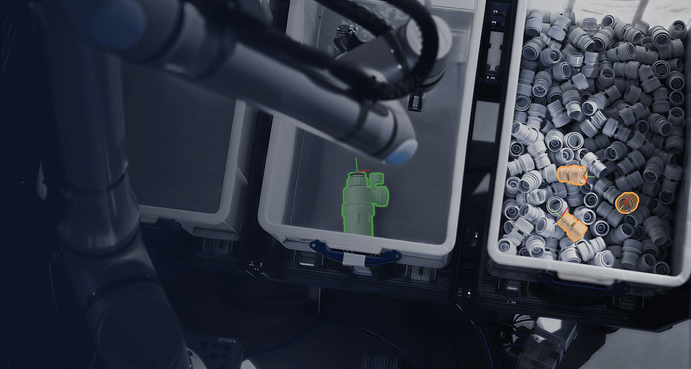 Scans the workspace and identifies every part instantly, even in cluttered bins with varying shapes, materials, and arrangements.