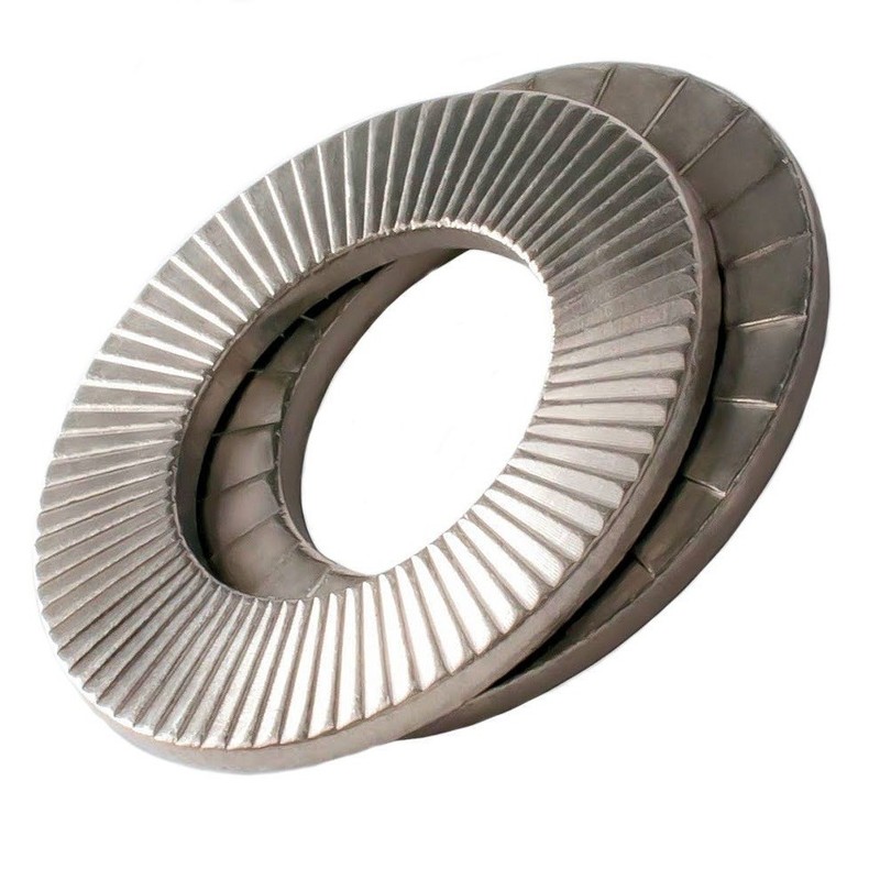 The broadly serrated inner surfaces prevent the fastener from unscrewing. Because of the wedges, any attempt to loosen the fastener will increase its preload before the washer is able to ratchet to the next set of wedges. Nordlock washers are an excellent choice of anti-vibration method.