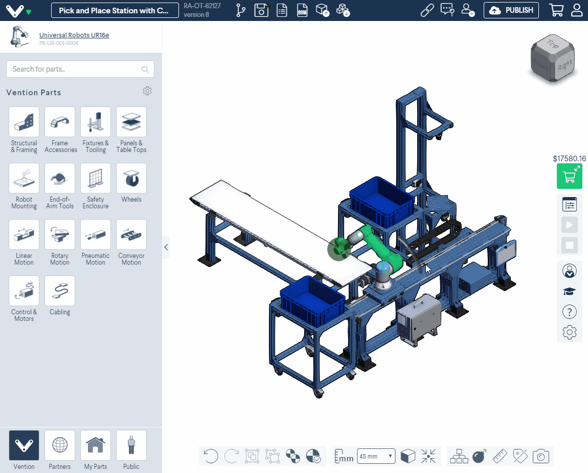 Today’s industrial robots cost a fraction of the price of their earlier counterparts. And new technology, like Vention’s cloud-based CAD program, is cheaper, more robust, and easier to program and maintain than ever before. Use cloud-based platforms to design all the custom equipment you need for the robot cell online, see the total cost and assembly time in real time, and order for next-day delivery, directly in the online 3D environment. You can even find “open-source” designs in Vention’s public library and customize them to fit your cell specifications. Get started on your first robot cell today.